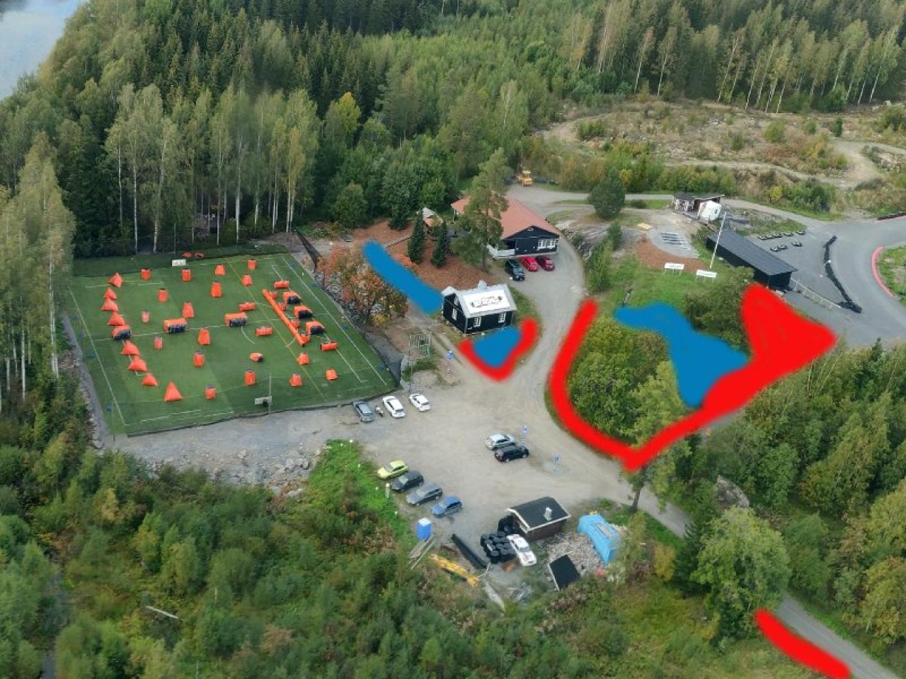 Pysäköinti tapahtuu ison parkkipaikan lisäksi kuvan osoittamiin punaisella merkittyihin paikkoihin.