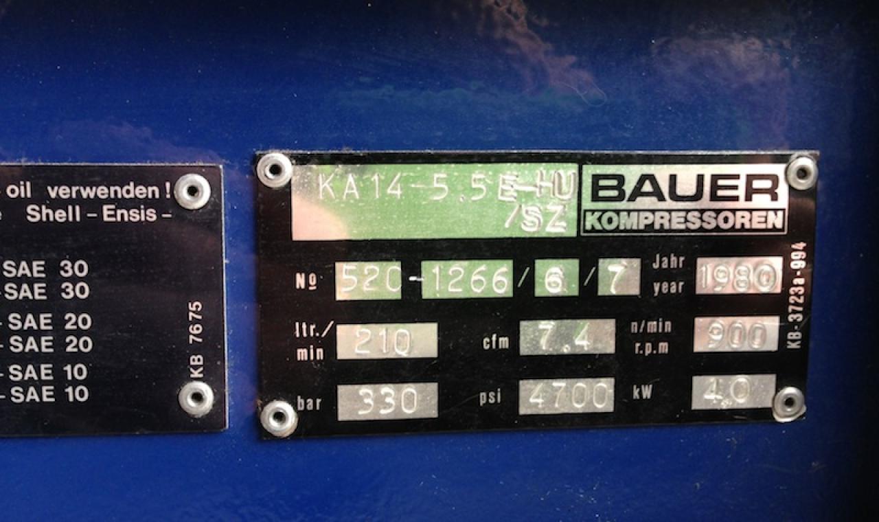 Bauer K14 ilmakompressori, nimellistuottokyky speksien mukaan 210 L/min, tää on kunnon laadukas -80 vm. Kolmivaihesähkömoottorilla. 330Bar, Autodrainillä. Painoa joku lähes 100kg... TAATTUA BAUERIN 80-luvun laatua materiaaleista säästämättä!!!