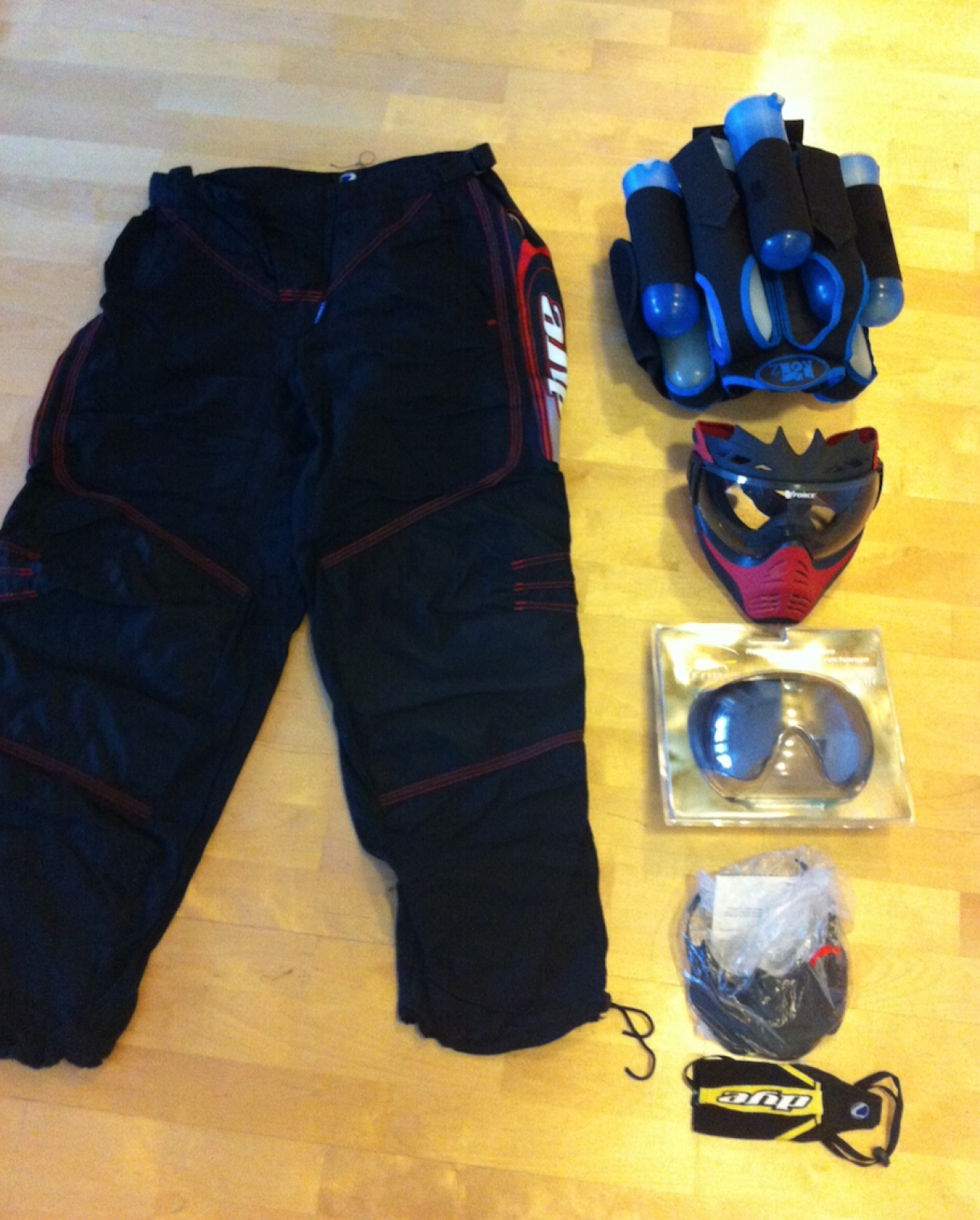 M:Maski V Force kirkas- ja peililinssi, Dye housut XL+piippusukka, bulkkivyö