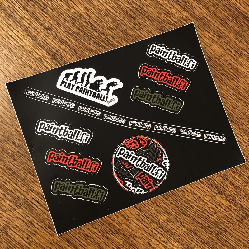 Jos haluat tukea Paintball.fi:n toimintaa, niin hyvä keino siihen ovat tarrat boxiin, mutkaan, maskiin jne. Tarra-arkissa erilaisia tarroja alla olevan kuvan malliin.