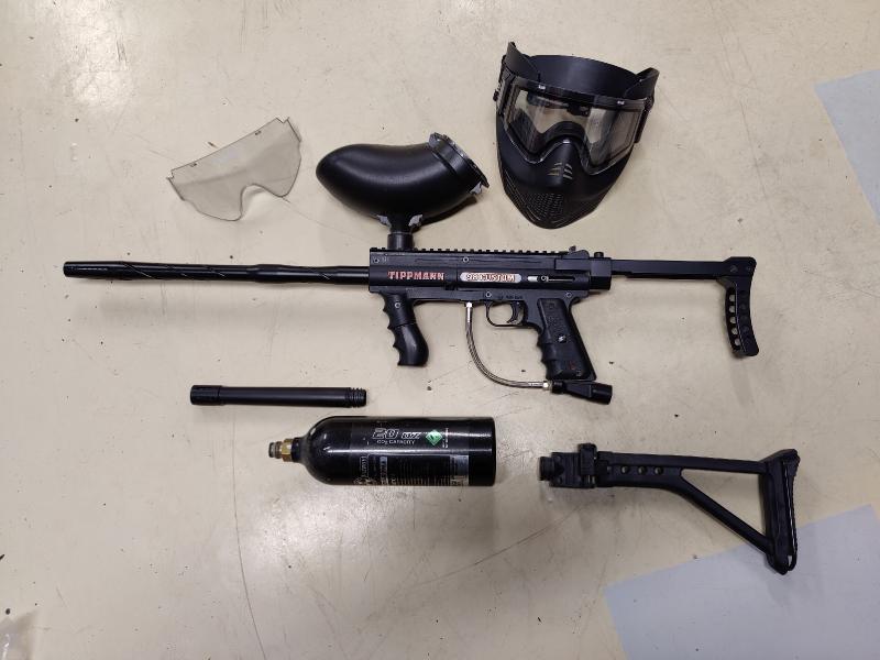 Myytävänä Tippmann Custom 98 muutamalla lisäosalla.